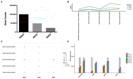 It is well known that pathogenic Escherichia coli is the main pathogenic bacteria, and its adhesion and virulence factors are secreted by Type I-VI secretion system (T1SS-T6SS) [59]. Therefore, the number of enrichment genes, bacteria secretion system and antibiotic resistance genes were conducive to the evaluation of the three methods. Notably, the number of enriched genes in the analysis result of RBUD was twice than that in ABUD and four times than that in RBED (Figure 7A). In COG functional enrichment analysis, almost all functions of bacteria secretion system were increased in disease group, which was detected by all three methods (Figure 7B). Moreover, KEGG functional analysis showed that RBUD and RBED were better than ABUD in functional enrichment of bacteria secretion system in disease samples (Figure 7C). The RBUD and RBED enriched aminoglycoside antibiotic resistance genes in disease group, which was consistent with the fact that the chickens were fed with antibiotics. However, the ABUD method did not detect any changes in antibiotic resistance genes (Figure 7D). The RBUD method can steadily reflect the disease-related functions in an avian colibacillosis case study, which is consistent with its performance in the T2D case study.