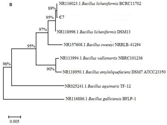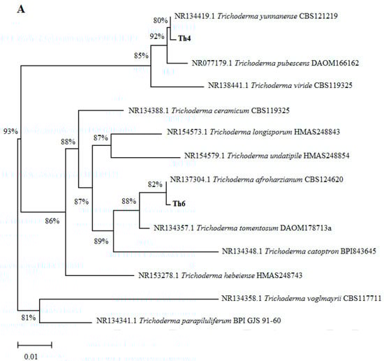 Fungal and bacterial isolates were identified by sequencing their internal transcribed spacer (ITS) and 16S rRNA genes, respectively. The Th4, Th6 and C7 isolate nucleotide sequences were subjected to basic alignment local tool (BLAST) analysis against the National Center for Biotechnology (NCBI) database. Phylogenetic analysis based on ITS showed that the Th4 and Th6 isolates had a close relationship with Trichoderma yunnanense and Trichoderma afroharzianum, respectively (Figure 1A). Likewise, the phylogenetic analysis based on 16S rRNA showed that the C7 isolate showed the highest similarity with Bacillus licheniformis (Figure 1B). The nucleotide sequences of Th4, Th6, and C7 isolates have been deposited in the NCBI under accession numbers MT762351.1, MT762352.1, and MT762371.1, respectively.