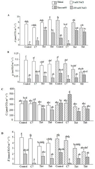 Photosynthetic parameters of wheat cultivars Shimai and Xiaoyan60 under the microbe and salt stress treatments. Control, C7, Th4, and Th6 represent uncoated seeds, C7 seed coating, Th4 seed coating, and Th6 seed coating, respectively. The salt stress levels were 0 mM NaCl and 200 mM NaCl. The values are the means of three replicates ± SE (n = 3). (A) Net photosynthesis (A), (B) stomatal conductance (gs), (C) intercellular CO2 (Ci), (D) transpiration (E), and (E) water use efficiency (WUE). The wheat cultivars: Shimai in white-gray bars and Xiaoyan60 in white-gray bars with course pattern. Different letters denote significant differences between the treatments and the cultivars according to Tukey-adjusted comparisons (p < 0.05). Means sharing a letter are not significantly different.