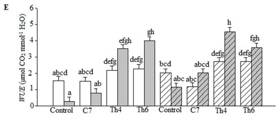 The leaf WUE was significantly (p < 0.01) correlated with all main factors (cultivar, microbial strain, and salt stress), with an interactive effect of microbial strains and salt stress (Table 3). Under stress conditions, WUE was found to be higher in seedlings grown from Th4 and Th6 irrespective of cultivar (Figure 2E).