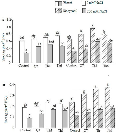 Biomass production of Shimai and Xiaoyan60 under microbe and salt stress treatments. Control, C7, Th4, and Th6 represent uncoated seeds, C7 seed coating, Th4 seed coating, and Th6 seed coating, respectively. The plant was harvested from the hydroponic vessel at the end of the experiment (32 days after sowing). The shoot (A) and root (B) fresh samples were wiped dry using soft paper towel, and the fresh weight was recorded immediately. The values are the means of three replicates ± SE, (n = 3). The wheat cultivars: Shimai in white-gray bars and Xiaoyan60 in white-gray bars with course pattern. Different letters denote significant differences between the treatments and the cultivars according to Tukey-adjusted comparisons (p < 0.05). Means sharing a letter are not significantly different.