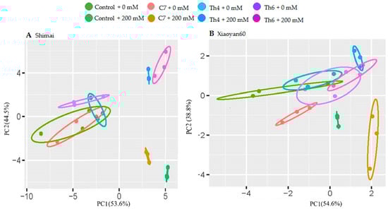 Results of two-dimensional principal component analysis (PCA) for photosynthetic gas exchange parameters in two wheat cultivars: (A) Shimai and (B) Xiaoyan60. Control + 0 mM and control + 200 mM are combinations of uncoated seed with 0 and 200 mM NaCl, respectively. C7 + 0 mM, Th4 + 0 mM, Th6 + 0 mM, C7 + 200 mM, Th4 +200 mM and Th6 +200 mM are combinations of seed coating treatments with C7, Th4, and Th6 under 0 and 200 mM NaCl, respectively.