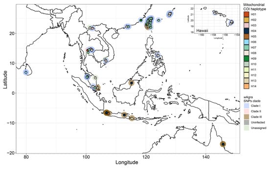 Geographical distribution, mitochondrial COI haplotype (H01-H14, inner circle) and wAgra SNPs clade (outer circle) of all A. gracilipes colonies in this study.