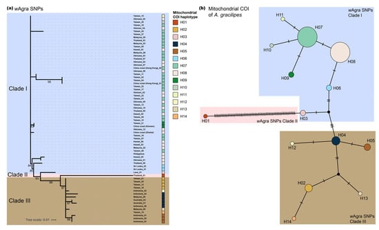 (a) Wolbachia (wAgra) SNPs phylogenetic tree based on Maximum Likelihood method. The mitochondrial COI haplotype of each sample is indicated in color boxes following individual name. Numbers at node indicate bootstrap support values (1000 replicates). Tree branches with <50% bootstrap supporting value were removed. (b) The median-joining network analysis of A. gracilipes mitochondrial COI haplotypes. The color shading depicts the wAgra SNPs clade displayed in (a). Circle area is proportional to the number of individuals carrying a given haplotype.