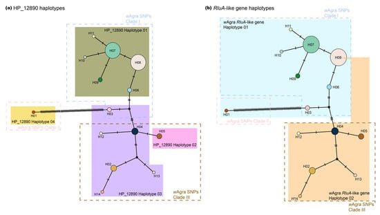 Mitochondrial COI haplotypes of A. gracilipes (circles in color) and their corresponding Wolbachia (a) HP_12890, and (b) RluA-like gene haplotypes. Dashed lines indicate the wAgra SNPs clade shown in Figure 2a. Circle area is proportional to the number of individuals carrying a given haplotype.