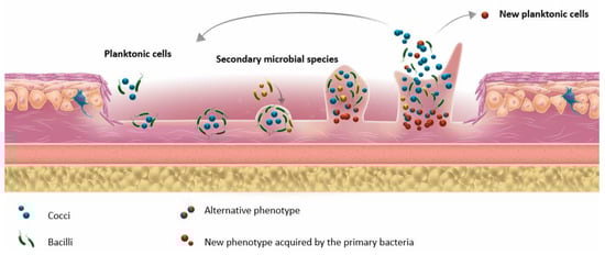 - Microbial cells within a biofilm can detach and disseminate in the wound environment. The behavior of the released bacteria may differ from that of the pioneering colonizing bacteria because of adaptation within the biofilm [30,35].