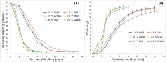 Effect of yeast strain and temperature on fermentation kinetics (reducing sugars (A) and CO2 loss (B)) of PABs.