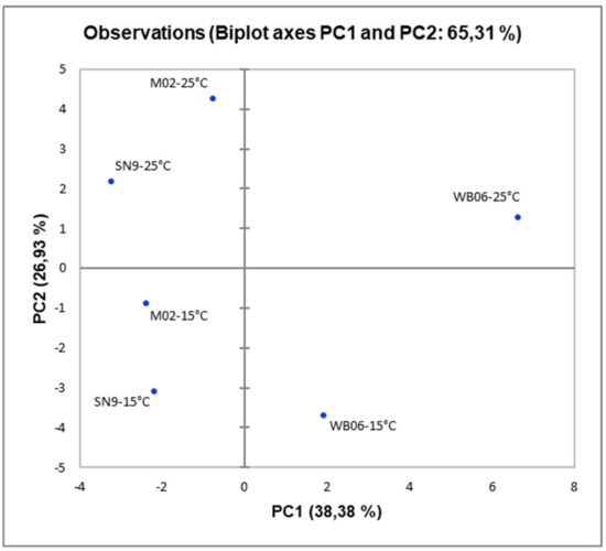 The PCA algorithm, applied to HS-SPME GC/MS data, showed that the fermentation temperature affected significantly volatile composition (Figure 2), since wines produced at 25 °C were placed at the upper side of the plot and wines produced at 15 °C were placed at the bottom. PAB produced by WB06 yeast contained compounds in amounts that correlated positively mostly to PC1, whereas M02 yeast resulted in compounds correlated mostly to PC2 for both fermentation temperatures. Consistently, by means of the PC1, it can establish a clear differentiation among the PAB obtained by fermenting pomegranate juice with different microorganisms. More specifically, PABs with M02 and SN9 are placed on the left side of the plot (negative values of PC1), while the PAB produced by WB06 (in both temperatures) are placed on the right side of the plot (positive values of PC1), characterized by the higher amount of alcohols and esters. On the other hand, according to the PC2, a clear distinction was observed between the PAB produced at different fermentation temperatures. The PAB produced at 25 °C, located at the upper side of the plot (positive values of PC2), while those produced at 15 °C, located at the lower side of the plot (negative values of PC2).