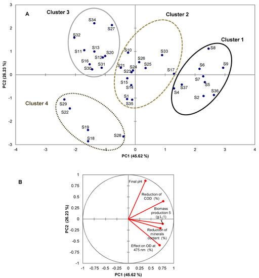 For instance, we detected some correlations for pH and COD reduction (with a Pearson correlation coefficient r of 0.508), reduction of minerals content and effect on OD475 nm (r = 0.503), biomass production with COD reduction on the one hand (r = 0.466) and the effect on OD475 nm on the other hand (r = 0.447). Applied to the five original variables, the Cattell’s scree diagram [68] highlighted three significant Principal Components (PC) explaining 84.89% of the total variance, 45.62% for PC1, 26.23% for PC2 and 13.81% for PC3 (Appendix A—Table A1). The active coordinates retained by PCA were used to create Figure 1A,B.