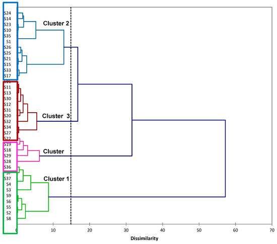 PCA indicated that the strains could be classified into three to four groups. According to hierarchical cluster analysis (HCA), four groups of strains with close characteristics had been defined, explaining 64.62% of the total inter-variance and 35.38% of the total intra-variance (Figure 2). The distribution of the clusters according PC1 and PC2 (Figure 1A,B) allowed us to define the common characteristics of strains belonging to the same cluster (Appendix A—Table A3). Cluster 1 including the 8 Aspergillus anamorphs strains and the 2 Trametes spp. was characterized by aerobic treatment resulting in both high biomass production, high COD and mineral content reductions and a strong impact on OD475 nm, resulting in significant decolourization. Cluster 3 included strains that led to a significant increase of OD475 nm that could reach 190.9% in comparison to the OD475 nm of crude DSW and conduced to the lesser mineral consumption. Cluster 4 consisted of strains whose effect on final pH was less important and that brought to a lesser biomass production and COD reduction. The final pH of DSW treated by strains defined in Clusters 1 and 3 were generally above pH = 8 whereas the pH of DSW treated by strains of Cluster 4 had a pH lower than seven. Cluster 2, which gathered all the other strains, was formed by strains that influenced COD and mineral contents and produced biomass on DSW, but less significantly than the strains of Cluster 1.