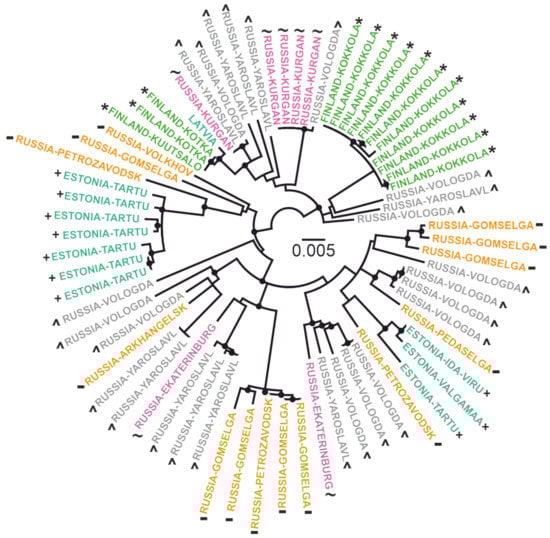 Maximum likelihood tree for Baltic TBEV-Sib (1054 nt). Black circles indicate nodes that were supported by UFBoot values over 95% []. Scale bar and branch lengths are the expected number of substitutions per site []. Countries or country regions of virus sampling were grouped into five color- and symbol-coded geographical regions: aquamarine, “+” — Estonia and Latvia; green “*”— Finland; orange, “-”—Karelia, Arkhangelsk, and Saint-Petersburg regions; grey, “^” — Vologda and Yaroslavl regions; and violet, “~”—Ekaterinburg and Kurgan regions.
