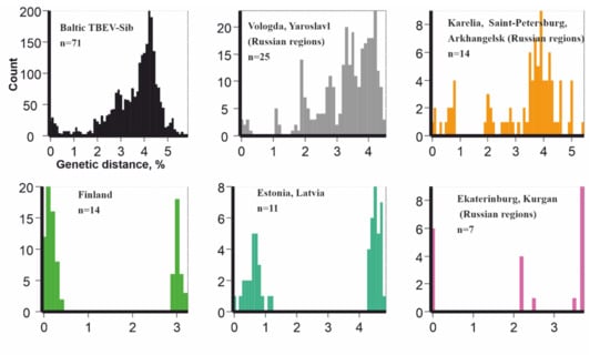 The phylogenetic analysis found a lack of geographic pattern in phylogenetic grouping, suggesting multiple long-distance transfers. Phylogenetically close viruses possessing common well-supported nodes were isolated from ticks collected in geographically distant regions. For example, four viruses from the Kurgan region (#FJ214128-FJ214131) were nearly identical to TBEV from the Vologda region (#FJ214153), and 1053 out of 1054 nucleotides coincided. At the same time, viruses from one location could be phylogenetically divergent. For example, viruses from the village of Gomselga formed three divergent clades in the phylogenetic tree. In order to compare genetic diversity in five separate geographic regions and the whole Baltic TBEV-Sib subgroup, we calculated the distribution of pairwise distances for these six datasets (Figure 3). Strikingly, all datasets showed comparable genetic diversity. The most diverse pair of viruses, #MT424736 from Gomselga (Russia) and #DQ451293 from Kokkola (Finland), differed by 5.6% in nucleotides. At the same time, #Karl12-T16353 from Petrozavodsk (Russia) and #Karl18-T27106 from Gomselga (37 km to the north from Petrozavodsk) differed by 5.2%. Moreover, #Karl08-T3467 and #MT424737, both found in Gomselga, differed by 4.5% in nucleotides. Such diversity could be formed after hundreds of years of evolution within each location. However, this contradicts the presence of nearly identical viruses isolated in geographically distant locations. Thus, it is most likely that there were several independent (re)introductions of TBEV into Karelia, as well as movements between other areas of the Baltic group.
