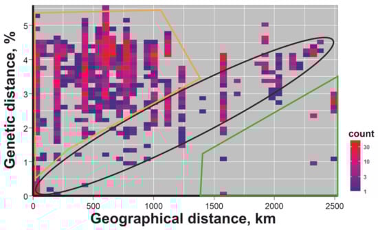 To further analyze the phylogeographic patterns of TBEV evolution, we visualised the dependence between pairwise genetic and geographical distances (Figure 4). Every dot on this heatmap plot corresponds to the pair of viruses. The y-axis indicates the percentage of different nucleotides in the studied E-gene fragment (1054 nt) between two viruses, whereas the distance (in km) between places of host collection for this pair are shown on the x-axis. The density of occurrence is indicated by colour (legend to Figure 4).