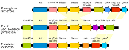 - Xu, T.; Wang, J.; Ying, J.; Zhu, T.; Liu, Y.; Xu, L.; Li, P.; Li, P.; Ying, J.; Li, K.; et al. Characterisation of a class 1 integron associated with the formation of quadruple blaGES-5 cassettes from an IncP-1β group plasmid in Pseudomonas aeruginosa. Int. J. Antimicrob. Agents 2018, 52, 485–491. [Google Scholar] [CrossRef]