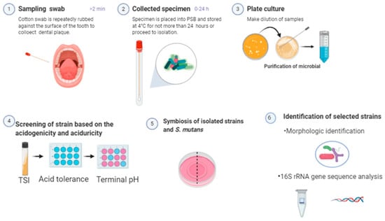 A total of 18 volunteers aged 21–56 years provided dental biofilm samples in which 7 of them are previously reported dental caries (DMFT > 0); the subjects were trained to sample and completed the questionnaire. All participants were informed about the aim of this study and signed informed consent before entering the study, the dental condition and diet habits were recorded for each participant. The modified protocol of a previous study was used to collect oral microorganisms []. Briefly, supragingival biofilm samples were collected using a sterile cotton swab in the morning before tooth brushing and breakfast. On the other hand, microorganisms also isolated from freshly extracted human maxillary incisors extracted for caries reasons (kindly provided by Limedentistry, Chuncheon, Korea). Infected teeth and the swabs containing biofilm samples were separately placed into 1 mL of 0.1% buffered peptone water (BPW, Difco, New York, NY, USA) and stored at 4 °C to use for not more than 24 h before the experiment. Samples were then sonicated for 30 s, vortexed to disperse, and the suspension dilutions were plated on Lactobacillus MRS agar (MRS, Difco), Tryptone Soy agar (TSA, Difco) with the addition of 5% defibrinated sheep blood, and Eosin methylene blue agar (EMB Difco). Single pure colonies were in a given sector of a plate, well-isolated colonies were selected and subcultured for isolation on a solid medium to ensure purity.