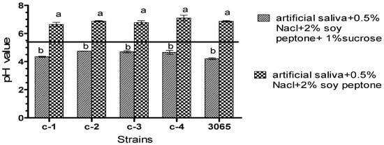 Acidogenicity of isolated potentially pathogenic oral bacteria was measured according to the method reported previously []. Briefly, bacteria were inoculated in BHI, and growth was monitored by SpectraMax i3 plate reader (Molecular Devices Korea, LLC, Seoul, Korea) until the optical density reached 0.5 (approximately 108–109 CFU/mL) at 595 nm. An amount of 0.1% BPW (pH 7.0) was used to wash the bacterial cells and incubated at 37 °C for 2 h for starvation. S. mutans KCTC 3065 (purchased from Korean Collection for Type Cultures, Daejeon, Korea) and isolates were inoculated into 2 mL of artificial saliva supplemented with 0.5% of sodium chloride and 2% of soy peptone separately. One percent (m/v) extra sucrose was added into the above artificial saliva solution to measure the sucrose dependence of acid production, while a sample without extra sucrose was used as control. Bacteria were grown at 37 °C and determined the pH of suspension using the pH meter.