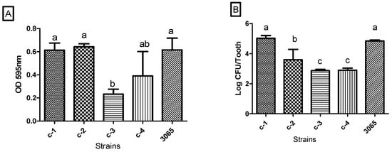 Biofilm formation of four isolated strains and one reference strain. Biofilms were formed on the surface of resin dentures and quantified through crystal violet assay (A) and cell enumeration (B) 3065: S. mutans KCTC 3065 C-1: Streptococcus salivarius; C-2: Streptococcus anginosus; C-3: Leuconostoc mesenteroides; C-4: Lactobacillus sakei. Vertical bars represent standard error of the mean (n = 3), different letters in the same group indicate a significant (p < 0.05) treatment effect.