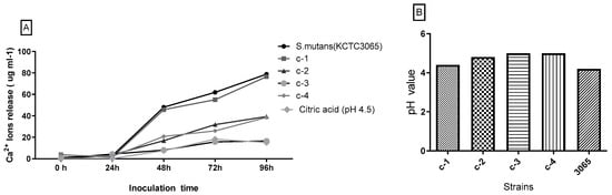 The main chemical component of tooth enamel is hydroxyapatite (HAP). The ability to dissolve HAP and release Ca2+ ions from the tooth is a clinical feature of cariogenic bacteria []. The ability of isolated strains to dissolve HAP was determined using protocols described previously with slight modification []; the assay was conducted as follows. Freshly extracted human intact teeth extracted for periodontal disease reasons (kindly provided by Limedentistry, Chuncheon, Korea) and were sterilized and dried using the protocol of resin denture sterilization described in Section 2.2.3. The disinfected teeth were placed in each well of 24-well plates filled with 2 mL of BHI medium with the addition of 1% (m/v) sucrose per well and were inoculated with 1% isolated bacteria, respectively. After 96 h of incubation at 37 °C, the Ca2+ ions release was measured using o-Cresolphthalein Complexone (OCPC) colorimetric method. An amount of 1 mL aliquot of calcium assay solution was reacted with 10 µL of the test samples. The absorbance of the resulting solution was measured at a wavelength of 575 nm. To eliminate the interference of different human teeth to the experimental results, each tooth was repeatedly disinfected and used alternately after each experiment; the data of Ca2+ ions release were expressed as average. The teeth were immersed in the medium without inoculation as the negative control, the pH of the medium adjusted by citric acid to 4.5.