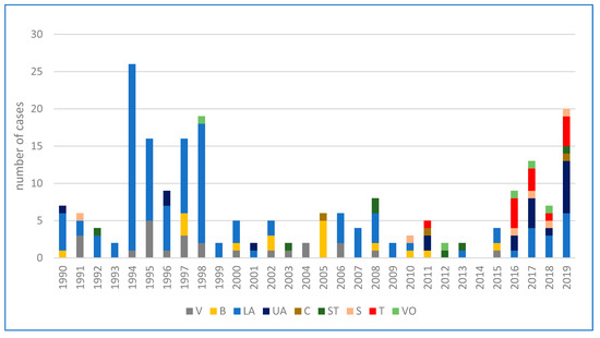 Cumulative cases of human tularemia in Austria divided by provinces from 1990–2019. Abbreviations: V = Vienna, B = Burgenland, LA = Lower Austria, UA = Upper Austria, C = Carinthia, ST = Styria, S = Salzburg, T = Tyrol, VO = Vorarlberg [82].