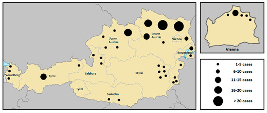 Summative geographic distribution of human tularemia cases in the various Austrian provinces from 1990 to 2019. The size of the dots corresponds to the number of humans infected with F. tularensis during a five year period [82].