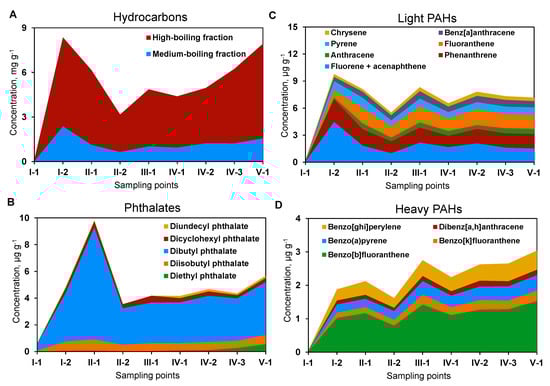 The identified concentrations of organic pollutants in the sediments resulted from a combination of two processes: sedimentation (increase of concentration) and degradation (decrease). The high boiling fraction prevailed among hydrocarbons in the CW sediment (71.5–81.7%), however, the distribution of both fractions in different CW zones had a similar trend (Figure 2A, Table S1). Zone I (sand traps) had the lowest concentrations of hydrocarbons (medium boiling fraction of 32 μg g−1, high boiling fraction of 115 μg g−1). A sharp increase in the concentration of hydrocarbons, especially of the high boiling fraction, was revealed at the end of zone I. There was a two to four times decrease in the concentrations of both fractions in zone II-2 (phytofilters). In the sedimentation tank (zone III), the hydrocarbon content increased again and continued to increase in subsequent areas, reaching the highest values in the outlet area of the CW (V-2) (Figure 2A, Table S1).