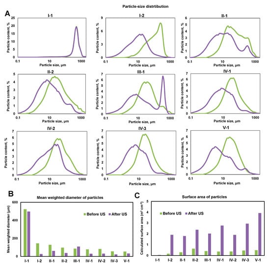 Laser analyser Microtrac Bluewave (Microtrac, York, PA, USA) was used to determine the particle size distribution (PSD) of the samples. The speed of circulation was 50% of maximum. Calculation of the results was made using the following parameters: particles were described as absorbing (absorption coefficient—1) and of irregular shape, refractive index of distilled water—1.33. Equipment software takes into account that the refractive index of absorbing particles does not significantly affect the results. The selected parameters were in agreement with the previous studies []. Two types of pre-treatment were used: with and without sonication. In the first case, a sample aliquot (a few millilitres) was placed directly on the sample dispersion controller unit of an analyser and was then analysed. In the second case, the samples were previously prepared by a horn type ultrasonic disruptor (Stepped Solid Horn 1/2″, Digital Sonifier S-250 D, Branson Ultrasonics, Danbury, CT, USA). Ultrasonic power was calibrated calorimetrically. Ultrasonic dispersion energy was 450 J mL−1.