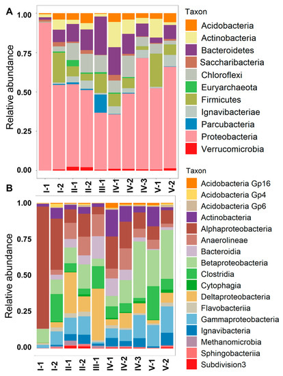 In general, the number of obtained nucleotide sequences ranged from 79,565 to 199,427 reads per sample. Representatives of 1013 genera belonging to 79 classes and 46 phyla were identified in the studied CW. The number of sequences ranged from 22,277 to 85,637 (the average for all the samples was 45,943) (Table S2). The sediments of different zones within the CW were characterized by a clear spatial heterogeneity of microbial communities (Figure 4A). The dominant phyla in microbial communities of the CW were Proteobacteria, Firmicutes, Bacteroidetes, Chloroflexi, and Actinobacteria. Representatives of Acidobacteria, Ignavibacteriae, and Verrucomicrobia were also identified in all the CW zones, but their relative abundances did not exceed 1–2% in most of the zones. Proteobacteria absolutely dominated in the inlet zone of the CW (I-1) with a relative abundance of 90.1%, as well as at the ends of phyto-treatment zones IV-2 and V-2 with shares of 62% and 55%, respectively (Figure 4A). The lowest share of Proteobacteria (16.6%) was detected in anaerobic zone III. In the remaining zones, the relative abundance of Proteobacteria varied in a narrow range of 33% to 37%. Firmicutes were almost absent in the inlet zone of the CW (I-1), however, in subsequent areas they were characterized by a high relative abundance, with a maximum in zones I-2 and V-1 (26.2% and 36.7%, respectively). Bacteroidetes and Chloroflexi had very similar distribution trends in different areas. The lowest shares of these groups were found in the inlet and outlet zones of the CW, while the highest relative abundances (17–26%) were present in the intermediate zones of the CW (from II-2 to IV-2). Zone II was characterized by a higher proportion of Verrucomicrobia and methanogenic Euryarchaeota. Parcubacteria had higher relative abundance in zone III, while Actinobacteria and Acidobacteria were more abundant in zone IV (Figure 4A).