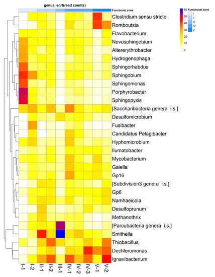 Altogether, 41 prokaryotic genera with a share of >0.5% were identified. Microbial composition in the inlet zone of the CW (zone I-1) was sharply different from other CW zones (Figure 5). Porphyrobacter (3.5%), representatives of Sphingomonadaceae family (Sphingobium, Sphingopyxis, Sphingomonas, Sphingorhabdus, and Novosphingobium were 21.4% in total), Hydrogenophaga (4%), and Altererythrobacter (1.2%) were dominant genera in this zone. The relative abundances of all these microbial genera were the highest in the inlet zone of the CW and significantly decreased in subsequent areas. In zone I-2, Sphingobium (2.6%), Fusibacter (5.1%), Proteiniclasticum (3.2%), and Acinetobacter (2.2%) were the most dominant genera within a microbial community. In the phytofilter zone, the shares of Smithella (from 0.1% in zone I-2 to 2.2% in zone II-1), Ignavibacterium (from 0.2% to 1%) and Methanothrix (from 0.1% to 0.9%) increased sharply. In terms of genera, the microbial community of the sedimentation tank (zone III) with anaerobic conditions was strongly different from other zones of the CW. In the sedimentation tank, Smithella (4.2%), Proteiniclasticum (3.5%), Parcubacteria (6.7%), Macellibacteroides (2.3%), and Desulfomicrobium (0.9%) were the dominant genera. In the phyto-treatment zone, Ignavibacterium, Saccharibacteria, Acidobacteria Gp16, and Smithella had the highest relative abundances within a microbial community, while at the end of this zone the shares of Dechloromonas (6.1%) and Thiobacillus (1.2%) strongly increased. At the beginning of the outlet zone (V-1), Clostridium (13.4%), Romboutsia (9.7%), and Dechloromonas (3%) were the dominant genera. In the outlet of the CW (V-2), Dechloromonas (4.6%), Ignavibacterium (2%), Thiobacillus (2.3%), and Romboutsia (7.7%) were the major microbial groups in the microbial community (Figure 5).