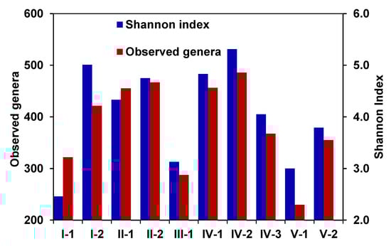 The difference between the lowest and highest values of DNA concentrations was 20 times. The lowest DNA concentrations, 2.4 and 4.8 ng µL−1, respectively, were revealed in the inlet zone of the CW (I-1) and in the sedimentation tank (III). Zones II-2 and IV were characterized by the highest DNA concentrations (38.3 and 47.5 ng µL−1, respectively) (Table S2).