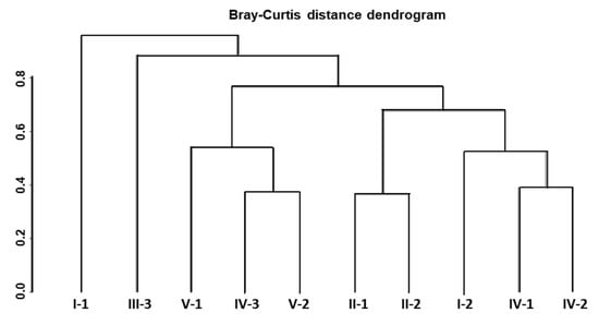 A dissimilarity analysis based on Bray−Curtis metrics allowed us to assess the extent of differences between microbial communities of different CW zones and separate them on several clusters (Figure 7). Microbial communities of I−1 (the sand trap in the inlet zone of the CW) and III−1 (sedimentation tank) zones were characterized by the highest differences compared to other zones (Figure 7). The microbiomes of II−1 and II−2, IV−1 and IV−2, as well as the final three zones corresponding to the final wastewater purification stages of the CW (IV−3, V−1 and V−2) were divided into separate groups.