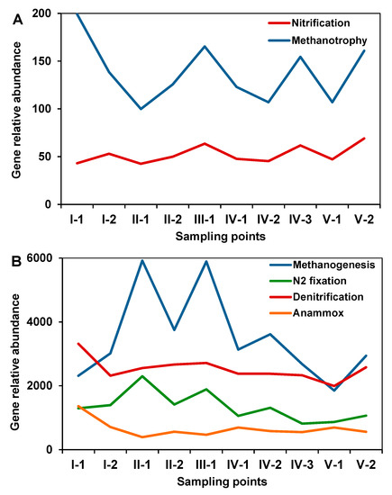 Using the Tax4 Fun software package, the functional gene profiles of microbial communities of different CW zones were predicted. The functional genes were grouped according to their certain microbiological processes-aerobic (nitrification, methanotrophy) and anaerobic (nitrogen fixation, denitrification, anammox, methanogenesis) (Figure 8A,B). The relative predicted abundances of genes responsible for anaerobic processes were 20 to 30 times higher compared with the genes associated with aerobic processes. The share of the predicted functional genes associated with nitrification was very small and practically did not change in different zones of the CW. Zone I (sand trap) was characterized by the largest share of the predicted functional genes associated with methanotrophy, anammox, and denitrification. Most of the functional genes responsible for nitrogen fixation were detected in zone II (phytofilters). The phytofilters and anaerobic sedimentation tank were also characterized by the highest predicted relative abundances of genes responsible for methanogenesis (Figure 8B).