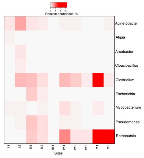 Among the potential human pathogens, seven genera were characterized by a share of more than 0.5% in at least one of the CW zones: Acinetobacter, Afipia, Arcobacter, Cloacibacillus, Escherichia, Mycobacterium, and Pseudomonas (Figure 9). Typical gut genera Clostridium (some strains may also be pathogens) and Romboutsia (pathogenicity has not yet been proven) have also been identified. The relative abundances of seven major human pathogens significantly decreased from the inlet (1.2–3.7% in total) to the outlet zone (0.5%) (Figure 9). On the contrary, the shares of Clostridium and Romboutsia increased in the outlet zone of the CW up to 13.4% and up to 9.7%, respectively.