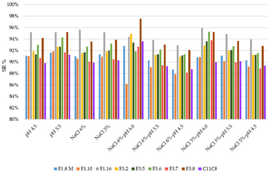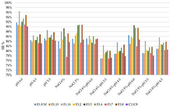 Different studies, conducted on the growth ability of L. plantarum species, confirmed the high versatility, adaptation ability, acidic, and salt tolerance as well as ability to decrease the bitter compounds naturally present in olive drupes [15,16,17,18,20]. In the present study, nine (9) selected L. plantarum strains were investigated for their growth behavior at single and combined stress conditions simulating the table olives fermentation. The growth ability of the tested strains at 32 °C and 16 °C, as reported above, was monitored up to 72 h and results are displayed in Supplementary Figures S1 and S2. At control condition (pH 6.0 and incubation at 32 °C) all tested strains, starting from an average value of 7 log CFU/mL, increased their cell density more than 2 log units. Overall, all strains appeared more resistant toward both single and multi-stress conditions at 32 °C (Figure S1), showing a mean increase of cell densities higher than 1 log unit. In order to evaluate the growth ability of each tested strains under both single and multi-stress conditions, the survival rate percentage (SR %) was calculated based on viable cells under control condition (pH 6.0 and incubation at 32 °C) and under each stressor condition. The viable cells were enumerated by plate count on MRS agar. Figure 1 and Table S1 show the SR % and the viable count (log CFU/mL) of the tested strains under each stressor at 32 °C, respectively. Overall, all strains showed the ability to survive under the tested stress conditions with SR % more than 85%. Zooming on each stress factor, out of the nine strains, 2 (F1.16 and F3.8) showed the highest SR % under all the tested stress conditions. Similar behavior was exhibited by the F3.2 strain except at NaCl 6% and pH 6.0. The performances of the tested strains appeared to be robust toward the different stressors, in accordance with previous studies, which validated the aptitude of L. plantarum species to tolerate acidic environments, for the intrinsic ability to maintain an internal pH gradient that allows the survival at a much lower external pH [26]. A recent study [38], carried out on L. plantarum KLOS 1.0328 strain, showed its greater inclination to tolerate acidic stress rather than osmotic stress, according to a previous work reporting that pH values from 5.0 to 9.0 did not significantly affect the growth of L. plantarum strains isolated from Italian Bella di Cerignola table olives [30]. However, the same authors asserted that salt concentrations higher than 4% negatively influenced the strain growth. On the contrary, other studies [39,40,41] reported the ability of L. plantarum strains to tolerate high (> 8%) NaCl concentrations. The tolerance to high salt concentrations and the ability to control osmotic stress have been recently confirmed [28], showing excellent growth performance of L. plantarum strains at 5% and 8% of NaCl. The authors observed that L. plantarum strains are equipped, at genomic level, with a complex molecular regulatory network involving genes associated with salt resistance through the recovery of the intracellular ion balance [28]. Our study clearly highlights that the growth behavior under stress conditions is strain-specific, especially at 16 °C (Figure 2 and Table S2). By including the temperature of 16 °C, as an additional stressor, data revealed that the growth performance detected among strains, was highly variable, appearing to be hampered by the multi-stress conditions. Moreover, comparing the behavior of each strain at different stress conditions, the growth performance, expressed as viable counts, was highly variable. Based on ANOVA results the strains F3.8, F3.7, and F1.16 showed the higher significant differences (Table S2). As expected, when incubated at 16 °C, the viable count at pH 6.0 was significantly lower than those observed at 32 °C (Table S2). Indeed, the low temperature significantly affected the growth performance of the strains both singularly and in combination with other stressing factors. Moreover, it is interesting to point out that at 16 °C under acidic conditions the growth of the L. plantarum strains was significantly affected. Our data were slightly in discordance with previous reports [30,31] that revealed high growth ability of L. plantarum strains at both 12 °C and 15 °C. Although both table olives process conditions and storage temperature may vary in relation to annual climate fluctuations, to type of containers and to industrial sheds, the most common temperature conditions measured during the fermentation process and storage period is about 20 °C. Hence, it is extremely important to select L. plantarum strains with enhanced technological performances at process parameters applied during table olives process production.