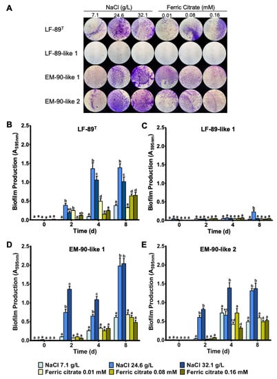 P. salmonis biofilm formation cultured under different NaCl and ferric citrate concentrations. (A) Representative CV staining of biofilm produced by P. salmonis LF-89 type strain and isolates LF-89-like 1, EM-90-like 1, and EM-like 2 at eight days (100× magnification). Biofilm quantification for P. salmonis LF-89 (B) and isolates LF-89-like 1 (C), EM-90-like 1 (D), and EM-90-like 2 (E) grown for 0, 2, 4, and 8 days. Values are presented as the mean ± SEM (n = 5). A two-way ANOVA followed by a Tukey HDS was performed to define the differences between media variation. Different letters indicate significant differences (p < 0.05).
