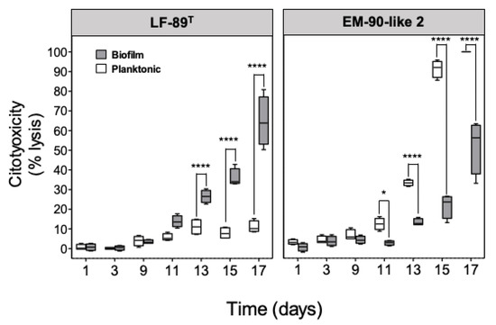 To evaluate the in vitro virulence generated by planktonic or sessile bacteria, a kinetic infection assay was performed using SHK-1 cells infected with the P. salmonis LF-89 type strain and EM-90-like 2 in both conditions. The viability of bacterial cells was evaluated by flow cytometry (Figure S1). The results showed independent cytotoxicity profiles for the strains in both conditions (Figure 2). Thus, although the cytotoxic effect of bacteria on cells tended to increase with time after infection with both bacterial strains (except for LF-89 planktonic), it is interesting to note that the effect of planktonic and sessile bacterial conditions was the opposite in the analyzed strains. Specifically, the sessile condition of LF-89 generated a sustained cytopathic effect, with increased cytotoxicity that reached about 60% after 17 days p.i compared to its planktonic condition, which caused only 10% of cellular lysis for the same time analyzed (Figure 2). In contrast, the sessile condition of the EM-90-like 2 strain generated only 20% cytotoxicity while the planktonic condition caused the highest effect in cellular lysis, which reached about 90% at day 15 post-infection (p.i).