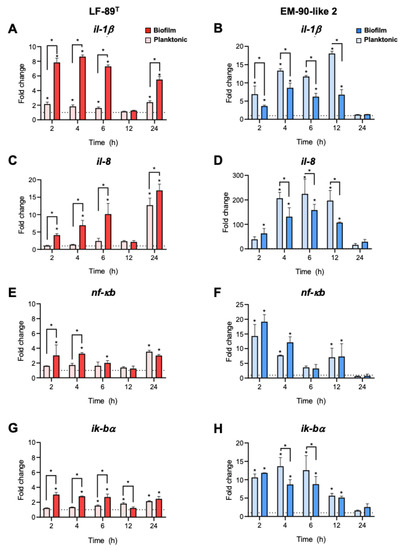 Analysis of the immune gene expression induced by planktonic and sessile P. salmonis. SHK-1 cells were infected with P. salmonis LF-89T or EM-90-like 2 strain in planktonic or sessile conditions for 2, 4, 6, 12, and 24 h, and the mRNA levels of il-1β (A,B), il-8 (C,D), nf-κb (E,F), and iκb-α (G,H) were analyzed by qRT-PCR. The expression of ef-1α was used as a normalizer. The graph depicts the average ± standard deviation of the gene expression fold change. Control cells were used as a calibrator (dotted line). Asterisks above the bars indicate statistically significant differences evaluated using Tukey’s multiple comparison test (p < 0.05).