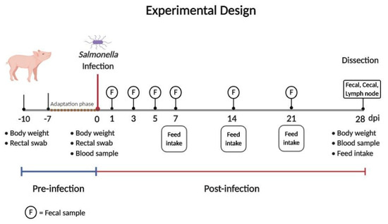 In accordance with standardized Salmonella diagnostics, a blood sample was taken from each animal on the day of the experimental infection and at the end of the experiment (Figure 1). Serum was examined serologically for specific antibodies against Salmonella; Salmonella antibody ELISA (IDEXX Swine Salmonella antibody Test, IDEXX Europe B.V., Hoofddorp, the Netherlands) was used. The cut-off value was ≥10% optical density (OD).