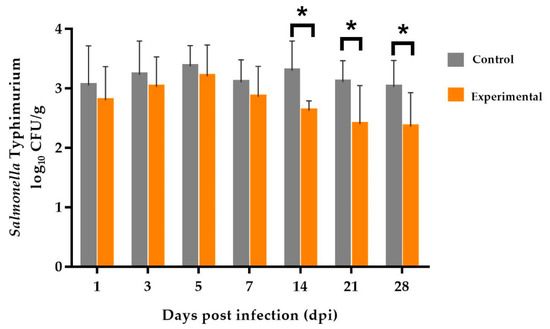 After oral infection with S. Typhimurium, different diets had significant influence on the counts of Salmonella in the cecal content (Table 3). The bacterial counts in the cecal content also differed significantly (log10 CFU/g; control group: 3.34 a ± 0.50, experimental: 3.08 b ± 0.56; p = 0.038; Table 3).
