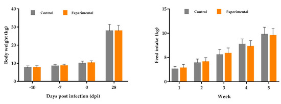As a result of the evaluations carried out, there were no significant differences in the performance parameters between the groups. During the experimental period, before and after infection, there were no significant differences in the body weight (BW), as shown in Figure 3 and in detail in Table 5 and Supplementary Table S3. Furthermore, feed intake was measured individually for the entire trial period. Differences between the groups regarding the mean weekly feed intake (FI) were not statistically significant (control and experimental; mean FI at week 5 (21–28 dpi, in kg): 9.78 a ± 1.52 and 9.40 a ± 1.48; p = 0.136; Figure 3 and Table S3).