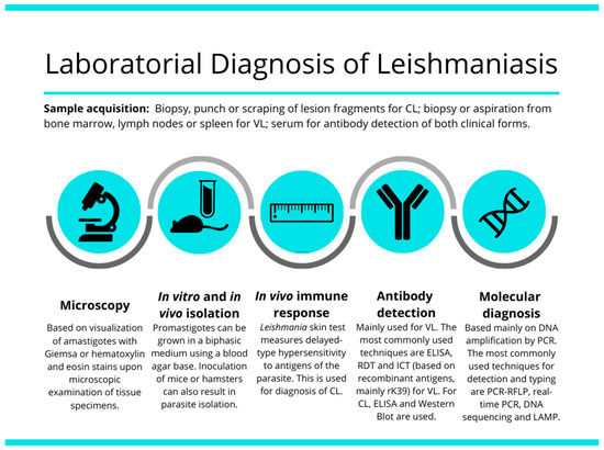 The numerous clinical manifestations of the disease mean the diagnosis of current and previous cases of infection is still a challenge for the correct identification of the etiological agent of the disease. Lesions in CL, for example, may vary greatly in relation to the size, clinical appearance and period of evolution and spontaneous cure. Clinical findings in patients with CL due to L. (V.) braziliensis or L. (V.) guyanensis have already been associated with a particular aspect of skin lesions related to number, size, location and pattern of lymphatic involvement [22]. Patients infected by L. (V.) guyanensis had smaller and more numerous lesions, located in most of the cases above the waist, while in infections due to L. (V.) braziliensis, patients had fewer lesions that were located mainly on the lower limbs [22]. In addition, differential diagnosis is essential because other diseases may have clinical aspects similar to CL (e.g., leprosy, keloid, skin cancers, tuberculosis, cutaneous mycoses) and VL (e.g., Chagas disease, hepatosplenic schistosomiasis, amoebic liver abscess, disseminated histoplasmosis, mononucleosis, hepatitis, tuberculosis, malaria, sickle cell anemia, lymphoma, chronic myeloid leukemia, systemic lupus erythematosus, and liver cirrhosis, among others) [5,9,12]. In regions where the disease is endemic, the diagnostic tests available may be limited and depend more on the resources and infrastructure available than the accuracy of the employed method.