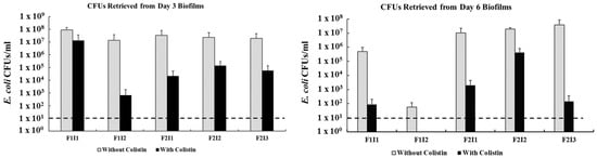 The persistence of mcr-1- positive E. coli in 3- and 6 days old biofilms. The grey and black colors designate CFUs retrieved on RAPID’ E. coli 2 agar plates without and with colistin (4 μg/mL), respectively. The dashed line designates the detection limit of the assay.