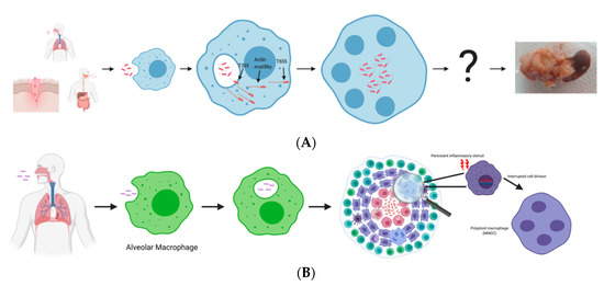 Mycobacterium tuberculosis is a historical human pathogen that exhibits a distinct infection cycle and manifestations in the infected host. M. tuberculosis is spread via infectious aerosol droplets that are dispersed by the cough of an infected individual. Upon inhalation of the infectious droplets, the bacteria travel to the lower airways where they are internalized by alveolar macrophages and begin to replicate. M. tuberculosis accesses the lung parenchyma through an unknown mechanism, but it is hypothesized that infected macrophages migrate through the epithelium, or that M. tuberculosis directly infects the epithelial cells and moves deeper into the tissue. Once M. tuberculosis has migrated into the tissue, the immune system begins to recruit inflammatory monocytes and leukocytes to contain the infection. This results in the initial stages of granuloma development [32]. The granuloma is a critical structure that has the dual role of containment and safe environment for the pathogen. The factors that influence the outcome of infection are not fully characterized, but it is thought that uncontrolled replication and an imbalance between pro- and anti-inflammatory mediators aids the bacteria to escape containment and result in active TB [33,34]. If the balance is right, the bacteria are contained, and the infection remains asymptomatic with the formation of mature granulomas containing dormant bacteria. The mature granuloma has specialized cells to contain the infection. Some of these include epithelioid macrophages, foam cells, and MNGCs. Epithelioid macrophages have undergone transcriptional changes that make them exhibit epithelial cell characteristics, including a zipper-like morphology [35]. Interruption of the transition results in decreased bacterial burdens [36], suggesting that they contribute to disease by protecting the bacteria from infiltrating leukocytes. This further highlights the duality of the granuloma. The MNGCs that form within the M. tuberculosis-derived granuloma have enhanced antigen presentation capabilities, but they exhibit a drastically reduced ability to uptake bacteria [37]. These MNGC are macrophages that became polyploid through interrupted cell division, not cell-to-cell fusion events like Bpm-induced MNGC. M. tuberculosis has no ability to fuse cells, and continuous inflammatory stimuli causes DNA damage that promotes polyploidy through incomplete cell division [38]. Other studies have shown that IL-4 and IL-13 play a role in cell fusion. The extent of these changes is unclear, but it is thought that the macrophage’s underlying activation state contributes to the response to IL-4 and -13 [39].