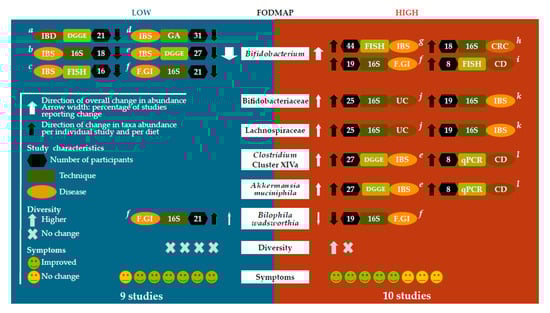 Graphical summary of the main findings. Overview of significant findings with low FODMAP diets (left, 9 studies) versus high fermentable carbohydrate intake (right, 10 studies) for taxonomic groups reported at two instances (Bifidobacterium, Bifidobacteriaceae, Lachnospiraceae, Clostridium cluster XIVa, Akkermansia muciniphila and Bilophila wadsworthia), as well as diversity measures (Diversity) and symptom severity (Symptoms). Studies not included in the figure did not report any significant change regarding the respective parameter. All individual study results are referenced (white letters: a. Cox et al., Gastroenterology, 2020; b. Staudacher et al., Gastroenterology, 2017; c. Staudacher et al., Journal of Nutrition, 2012; d. Bennet et al., Gut, 2018; e. Halmos et al., Gut, 2015; f. Huaman et al., Gastroenterology, 2018; g. Silk et al., Alimentary Pharmacology & Therapeutics, 2009; h. Xie et al., Nutrition, 2019; i. Lindsay et al., Gut, 2006; j. Valcheva et al., Gut Microbes, 2019; k. McIntosh et al., Gut, 2017; l. Halmos et al., Clinical and Translational Gastroenterology, 2016). Abbreviations: IBD: inflammatory bowel disease; IBS: irritable bowel syndrome; F.GI: functional gastro-intestinal disorder; UC: ulcerative colitis; CRC: colorectal cancer; CD: Crohn’s disease; DGGE: denaturing gradient gel electrophoresis; GA: GA-map™ Dysbiosis test; 16S: 16S ribosomal amplicon profiling; FISH: fluorescent in situ hybridization; qPCR: quantitative polymerase chain reaction.