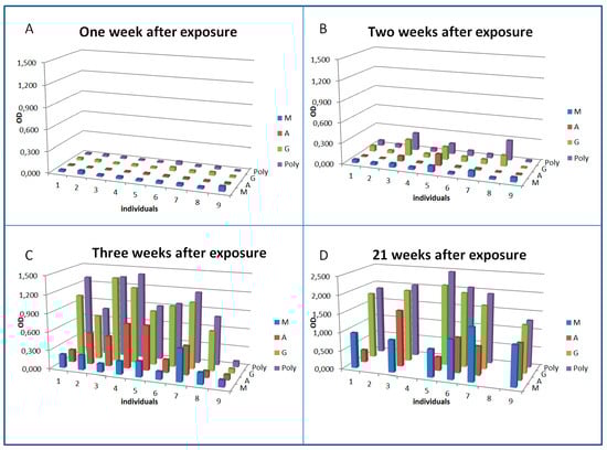 All nine patients were negative for antibodies against the pathogen one week after exposure (Figure 1A–D).