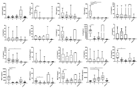 Serum cytokine and chemokine responses were analyzed by LegendPlex assay (BioLegend, Fell, Germany). See Supplementary Table S1 for the analyzed mediators and their respective detection limits. For time sampling points 1–3 (1, 2, and 3 weeks after exposure), sera from all nine patients for whom antibody testing was performed were available. For time sampling point 4 (21 weeks after exposure), only sera from patients 1, 3, 5, 6, 7, and 9 were available. As controls, 16 sera from healthy blood donors who were seronegative for tularemia were employed. These 16 sera were randomly picked from a larger group of negative sera. Patients were grouped according to their respective time sampling points. Statistical analysis was performed with GraphPad Prism 7 software (GraphPad Software Inc., La Jolla, CA, USA). For comparison between the analyzed groups, the Kruskal–Wallis test with subsequent Dunn’s multiple comparisons test was used.