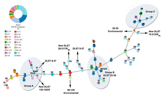 - Francisco, A.P.; Bugalho, M.; Ramirez, M.; Carriço, J.A. Global optimal eBURST analysis of multilocus typing data using a graphic matroid approach. BMC Bioinform. 2009, 10, 152. [Google Scholar] [CrossRef]