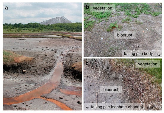 The potash tailing pile in Teutschenthal, Germany. (a) The plain in front of the tailing pile represents an abandoned lignite mine, which is regularly flooded by highly saline tailing pile leachate. (b) Biocrusts close to the Teutschenthal tailing pile between the vegetation and tailing pile body and (c) between the vegetation and tailing pile leachate water channels.