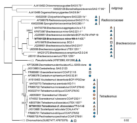 In order to define the original strains more precisely (to the species level), ITS-1,2 phylogenies of several Chlorophyta and cyanobacteria genera were calculated. Some original strains of the Sphaeropleales, Chlorophyceae, and Trebouxiophyceae clearly clustered in clades formed by known species: Bracteacoccus minor (Figure 7a), Pseudostichococcus monallantoides, Diplosphaera chodatii (Figure 8a), Chloroidium saccharophilum (Figure 9a), and Pseudochlorella signiensis (Figure 9c). A Tetradesmus strain clustered within the strongly supported group formed by several species perhaps representing the same taxon (“Scenedesmus” rubescens, “Scotiellopsis” reticulata, and Tetradesmus dissociatus (Figure 7b).