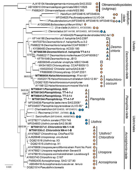 Molecular phylogeny of the Ulvophyceae based on SSU rRNA gene sequencing. The phylogenetic tree was calculated by the Bayesian method, including posterior probabilities (PP) with additional maximum likelihood bootstrap values (BP); branches are supported by both methods in bold (BP > 60% and PP > 0.9). Authentic strains were marked with an asterisk, original strains from this study in bold. Habitats of the strains were classified according to habitat type (Δ terrestrial = absence of permanent water, o aquatic = presence of water, ◊ phycobiontic or endophytic, and □ unknown) and saline (