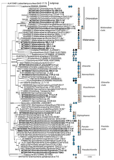 Taxa were named after current taxonomically accepted species or genus names stated in AlgaeBase [99] using the respective references (Table 1). Subsequently, the original habitats of all strains were classified as follows: aquatic (frequent presence of water, e.g., marine, freshwater, brackish water, bog water; both planktonic and benthic, or in microbial mats); terrestrial (in the absence of permanent water, e.g., on soil, bark, leaves, stones, facades, in biocrusts, or other nonaquatic biofilms); and endophytic/phycobiontic (e.g., phycobionts in lichens or endophytes in macrophytes, hereafter endophytic). The symbols are colored according to the salinity of the habitats (blue = nonsaline, e.g., freshwater and soil; orange = saline, e.g., marine, brackish and saline soil; black = other extreme conditions, e.g., acidity, heat, and radioactivity; and grey: unknown).